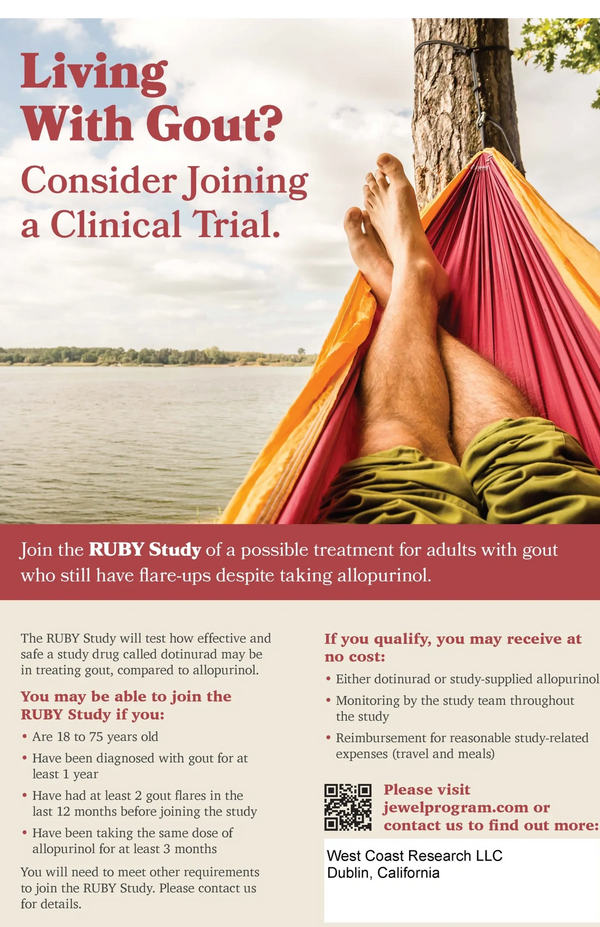 The Ruby Study is a clinical trial of a possible treatment for adults with gout who still have flare-ups despite taking allopurinol.