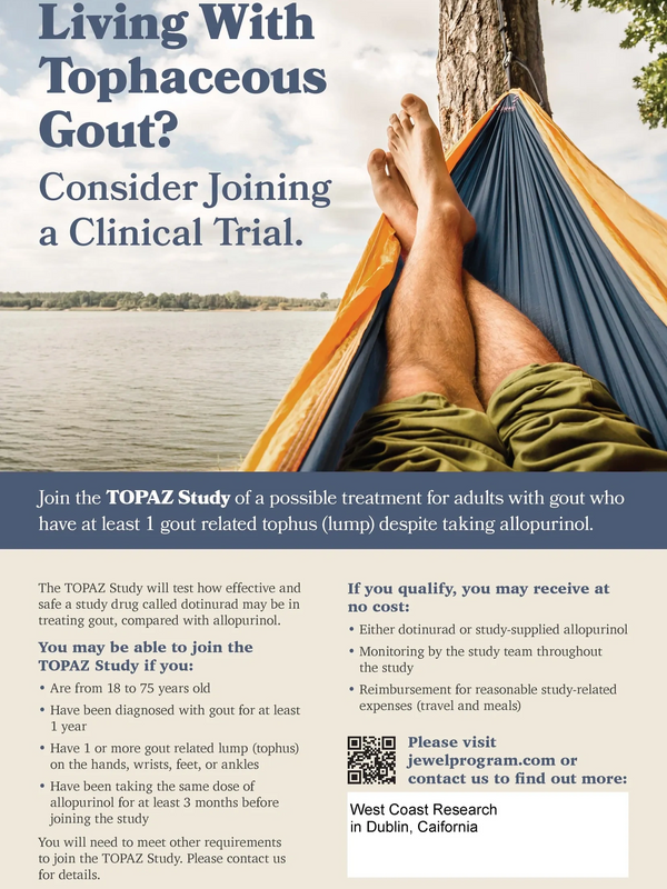 Join the TOPAZ Study of a possible treatment for adults with gout who have at least 1 gout related tophus (lump) despite taking allopurinol.